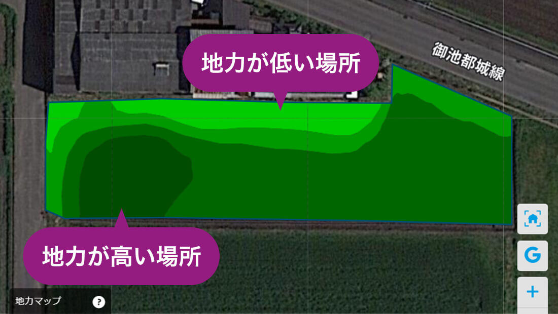 はい、地力マップで地力の低い場所が分かり、肥料を多めに撒いたことで、昨年と比べて、収穫量が15%アップしました。